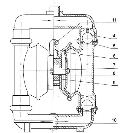 1 進(jìn)氣口 2 配氣閥體 3 配氣閥 4 圓球 5 球座 6 隔膜 7 連桿 8 連桿銅套 9 中間支架 10 泵進(jìn)口 11 排氣口