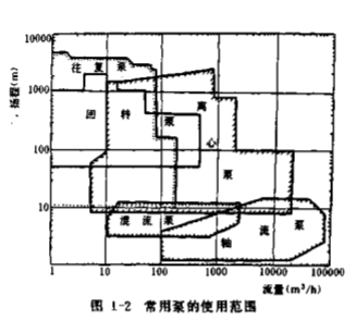從圖中可以看出容積式泵適用于高揚程、小流量場合。葉片泵覆蓋了從低揚程到高揚程、從大流量到小流量的廣闊區(qū)間,使用